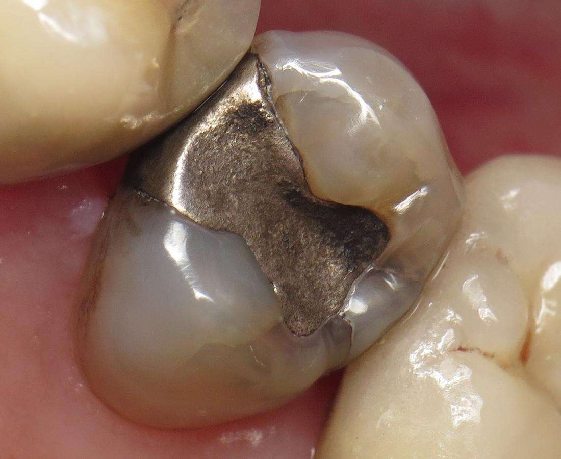 Before-and-after image showing a metal filling replaced with a natural-looking tooth-colored crown in Pampa, TX. See the seamless, smile-enhancing results of modern restorative dentistry.